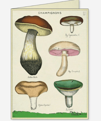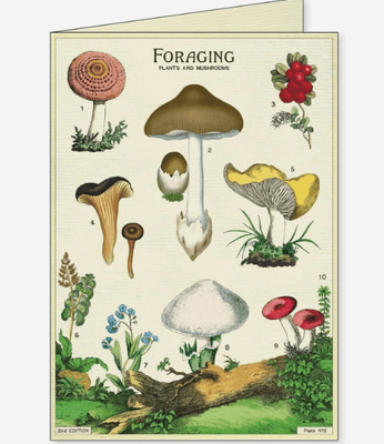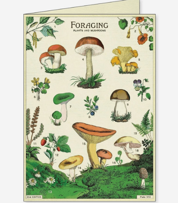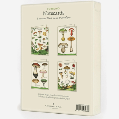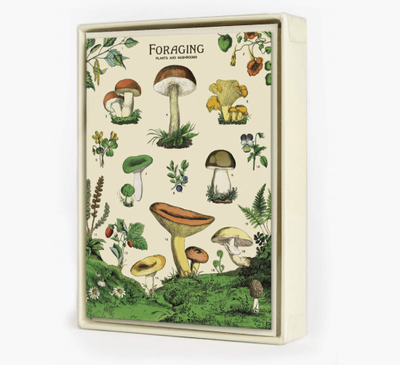Cavallini & Co's Foraging Notecards showcase a delightful assortment of mushrooms alongside select edible plants, all beautifully illustrated against a rich forest backdrop. This set includes four distinct card designs, each capturing the essence of nature's bounty.