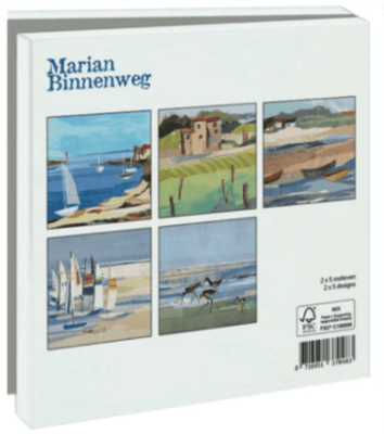 - The "Summer Breeze" notecard set by Bekking & Blitz features a beautifully illustrated scene depicting sailboats on a serene beach, evoking a sense of tranquility and summer leisure.