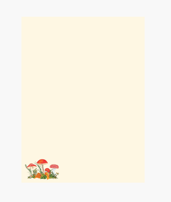 - Each letter sheet features a vibrant woodland design in the lower left corner, with mushrooms, leaves, and ferns against an ivory background.